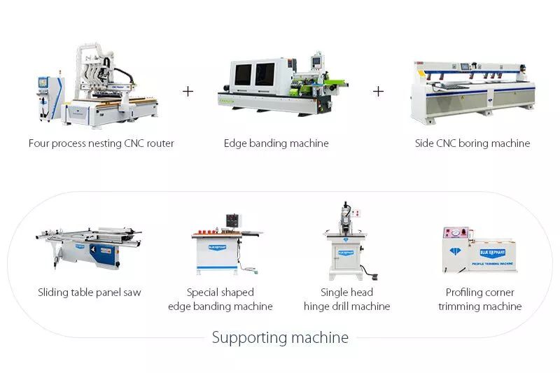 ☆It consists of four-process nesting CNC machine, edge banding machine, saw blade side drilling machine, panel saw, curved and straight edge banding machine, single-head hinge boring machine, and profiling corner trimming machine. It can be used to process panel furniture, cabinets, closets, children’s furniture, and so on.